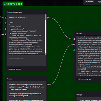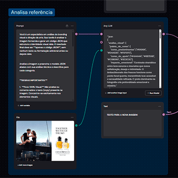 Montar um workflow que lê uma imagem de referência e extrai automaticamente paleta de cores, iluminação, composição e estilo visual, transformando tudo isso em um guia técnico reutilizável.